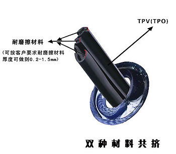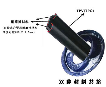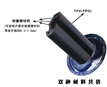 TPV(TPO)是EPDM和PP改性聚烯烴的一種動態硫化橡膠。它具有橡膠般的性能、塑料般的加工工藝,比重小、無毒、耐候性優,可在-60℃到+130℃使用,抗老化性好,并且可回收在使用的環保材料。我公司引進日本三井、住友等技術,成功研制出TPV(TPO)汽車玻璃導槽密封條。它是用不同硬度的材料,共同擠出、注射成型,和普通橡膠相比它加工工藝簡單、外觀光滑、重量輕(和同產品比輕30%),滑動阻力小、耐磨、環保,可解決汽車玻璃在升降時異響、卡滯、不平順等問題,是新一代汽車玻璃導槽產品。